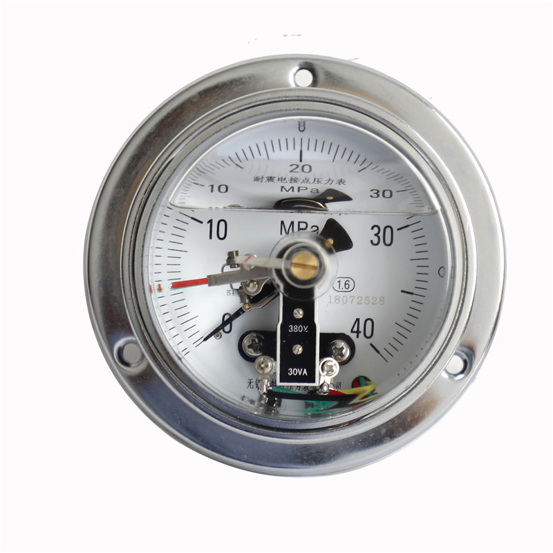 電接點(diǎn)壓力表廣泛應(yīng)用于石油、化工、冶金、電站等工業(yè)部門或機(jī)電設(shè)備配套中測量無爆炸危險(xiǎn)的各種流體介質(zhì)的壓力。通常,儀表經(jīng)與相應(yīng)的電氣器件(如繼電器及接觸器等)配套使用(接點(diǎn)形式有上下限型、雙上限型、雙下限型三種接點(diǎn)形式可供選用),即可對被測(控)壓力系統(tǒng)實(shí)現(xiàn)自動控制和發(fā)信(報(bào)警)的目的。接液材質(zhì)有銅質(zhì)或不銹鋼等用戶可根據(jù)實(shí)際使用情況可選。廣泛應(yīng)用于石油、化工、冶金、食品等工業(yè)部門壓力測量。