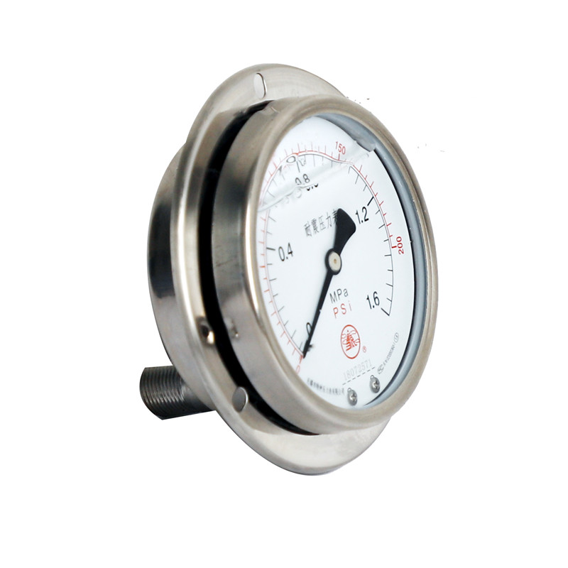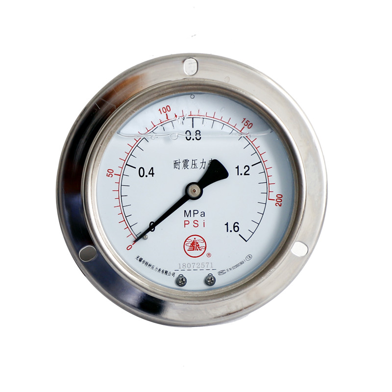 軸向前邊耐震壓力表是耐震壓力表系列中常用的一種,安裝時利用耐震壓力表自帶的安裝邊(盤)固定在設(shè)備面板上,方便操作人員隨時觀察壓力變化。軸向前邊耐震壓力表表殼為全密閉型結(jié)構(gòu),內(nèi)部填充阻尼液(一般為甘油或者硅油)并加裝緩沖機(jī)構(gòu),減輕環(huán)境劇烈振動及介質(zhì)脈沖對儀表示值的影響,耐震型壓力表指示穩(wěn)定清晰。廣泛應(yīng)用于液壓機(jī)械、石油、化工、冶金、礦山機(jī)械、電力設(shè)備等部門,測量對銅和銅合金無腐蝕性介質(zhì)的壓力。使用壽命長,是普通壓力表的替代產(chǎn)品,防護(hù)等級IP65。